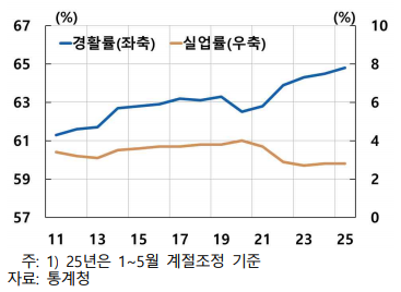 특히 2016~2019년에는 남성 경제활동 참가율이 하락하며 취업자수 증가가 둔화됐으나, 팬데믹 이후 유연근무제 확대와 서비스업 일자리 증가로 여성과 고령층의 경제활동 참가율이 크게 높아져 하방 압력을 일부 완충했습니다. 2025년에는 경제활동 참가율 상승세가 둔화되며 취업자수 증가 규모가 10만 명대 후반으로 추정됩니다.