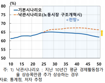 구조개혁이 결실을 맺어 경제활동 참가율이 2050년까지 4% p 상승한다면, 취업자수 감소 시점이 5년가량 늦춰지고, 2050년경 취업자수 규모도 2024년 대비 95% 수준까지 높아질 수 있습니다. 1인당 GDP 성장률 역시 연평균 0.3% p 높아지고, 연금·의료비 지출 부담도 완화될 것으로 분석됩니다.