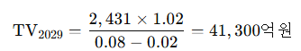 연도 FCF (억원) 현재가치(PV, 억원) 2025 2,000 1,852 2026 2,100 1,801 2027 2,205 1,750 2028 2,315 1,699 2029 2,431 1,649 합계 11,051 8,751 5.3 터미널 가치(Terminal Value)