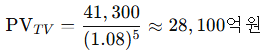 - 주당 내재가치 = 25,151억원 ÷ 8.8억주 ≈ 28,580원