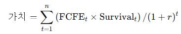 - 예: 1년차 생존확률 80%, 2년차 60%라면, 해당 연도 CF에 그 확률을 곱한 후 할인