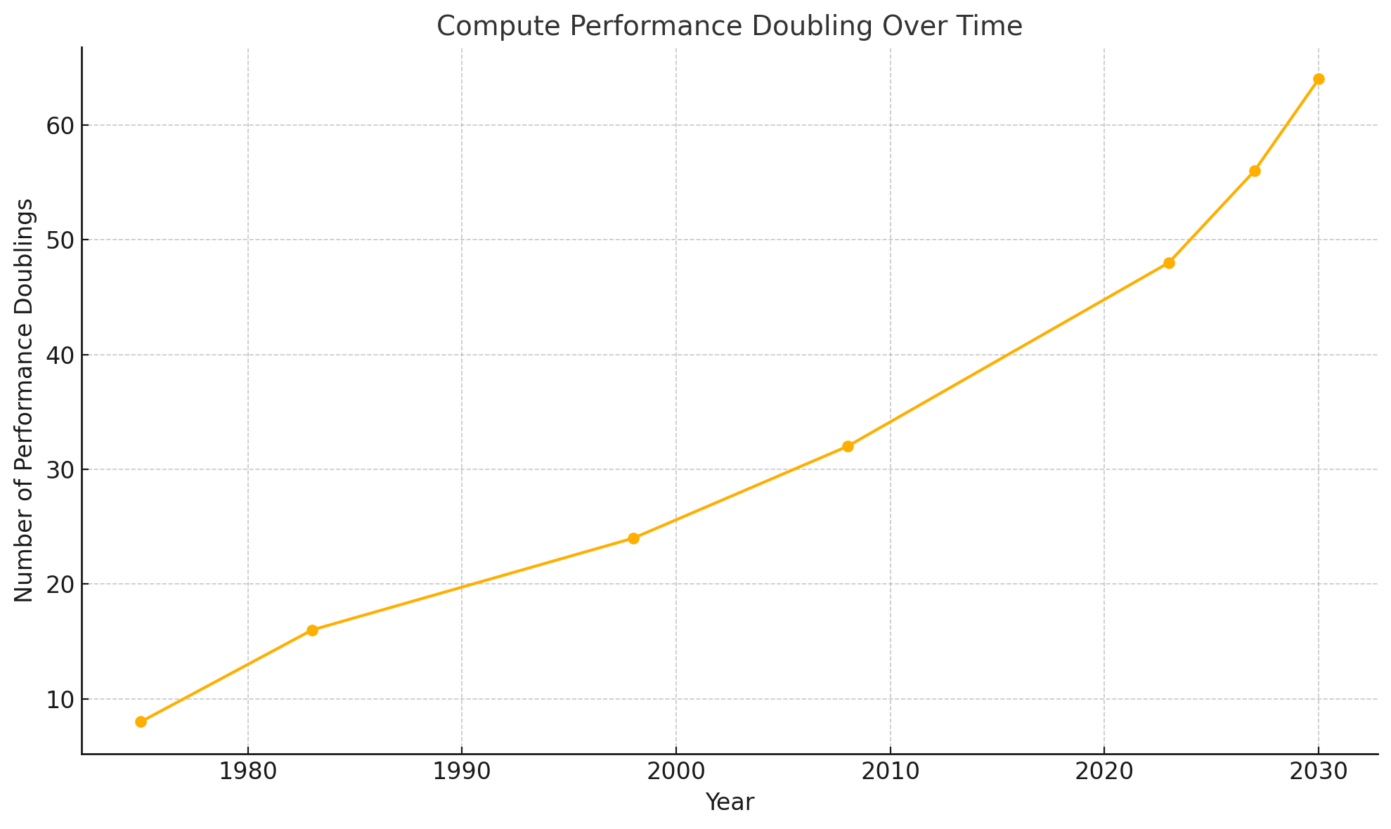 컴퓨팅 성능은 반도체 통합회로 개발 초기부터 일정 주기로 두 배씩 향상 돼왔습니다. ARK는 2018년 AI 혁신 사이클 진입 이후 성능 두 배 증가(Doubling)가 40회에서 2023년 48회로 가속됐고, 2030년에는 64회에 달할 것으로 예측합니다. 이는 인도 체스판 전설의 후반부와 유사한 폭발적 성장을 의미하며, 기술 발전의 ‘진짜’ 가치는 체스판 전반이 아닌 후반부에서 극적으로 드러납니다. 이러한 컴퓨트 성능 향상은 AI 모델 학습·추론 비용을 급감시키고, 차세대 클라우드 데이터센터의 연산 수요를 폭발적으로 증가시킬 것입니다.