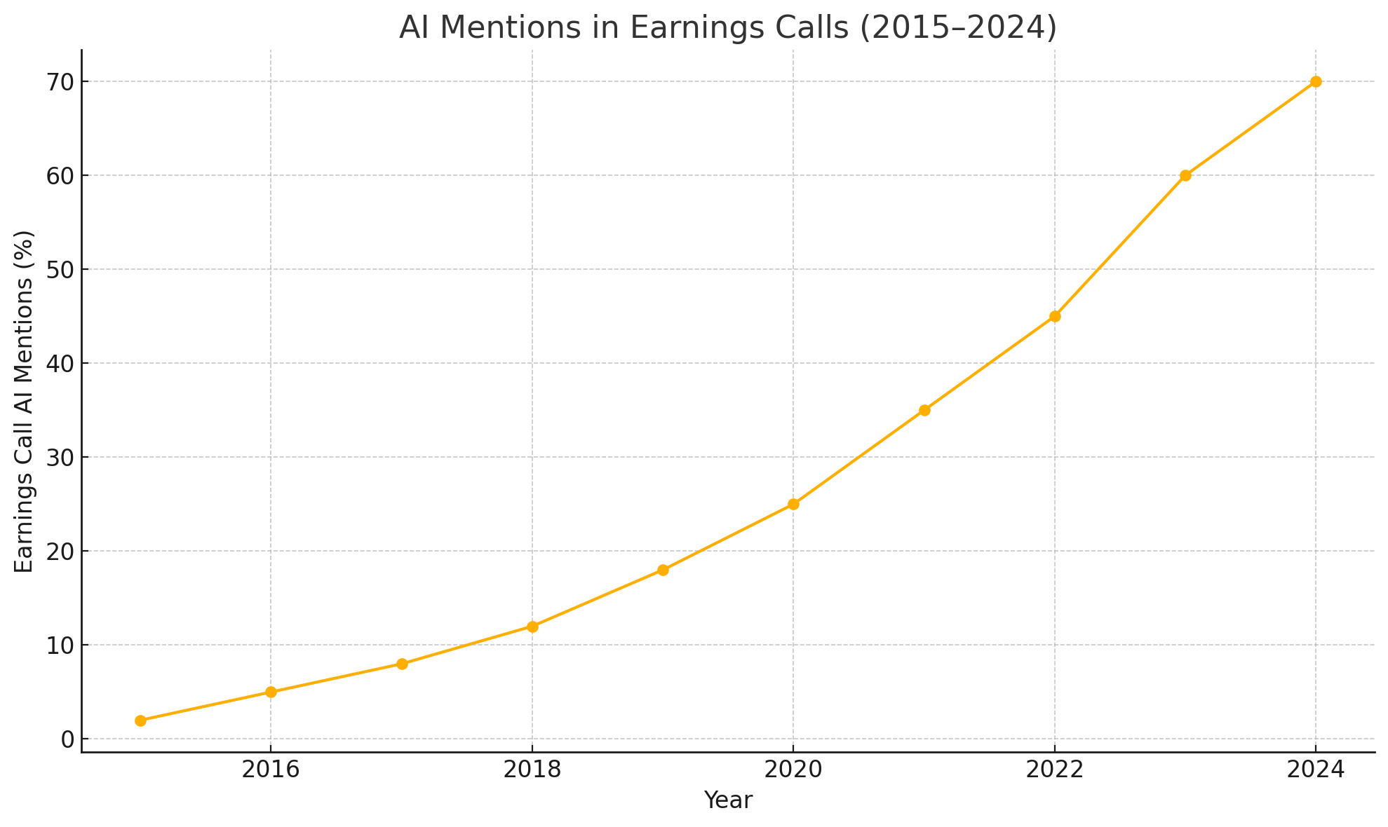 AI는 단순한 기술 도구가 아니라 금융, 헬스케어, 제조, 소비재, 물류 등 거의 모든 산업에 걸쳐 적용되며 새로운 비즈니스 모델을 창출하고 있습니다. 2015년 업종별 실적발표(Earnings Call)에서 AI 언급 비율은 5% 미만에 그쳤으나, 2024년에는 25%를 넘어섰습니다. 특히 헬스케어 분야에서는 LLM이 의료 자문과 진단 보조 기능을 수행하며 Dr. Google을 대체할 가능성이 높아졌고, 금융 서비스 영역에서는 디지털 지갑과 연동한 맞춤형 자산 관리 서비스가 등장하고 있습니다.
