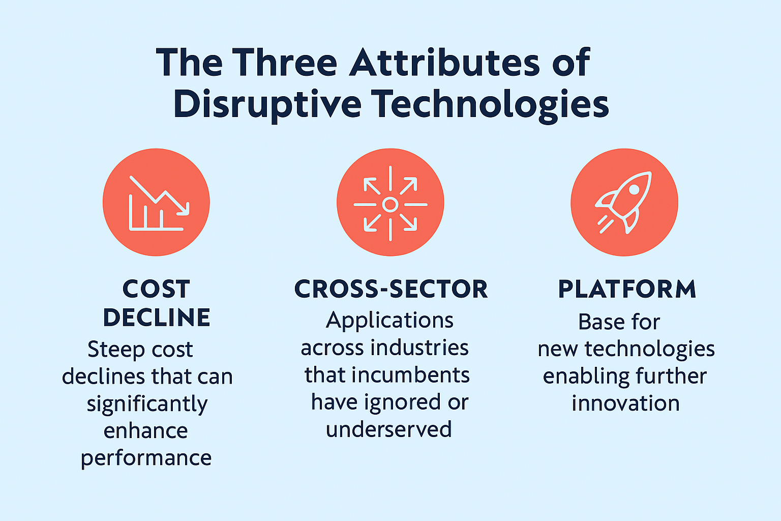 기술 혁신의 역사에서 ‘파괴적 기술(disruptive technology)’은 자원이나 규모 면에서 열세인 신생 기업이 기존 거대 기업을 위협하거나 시장 판도를 뒤바꾸는 능력을 뜻합니다. 기존 질서를 유지하려는 기업들은 종종 파괴적 기술의 잠재력을 과소평가하거나, 단기적 손익을 이유로 전략적 대응을 미루곤 합니다. 그러나 파괴적 기술은 세 가지 핵심 속성을 통해 시장에서 기회를 창출합니다. 첫째, 가파른 비용 절감 곡선(steep cost decline)을 보여 추가 자본 투자 없이도 급격한 성능 향상을 가능케 합니다. 둘째, 전통적 경쟁 구도가 무의미한 새로운 시장 영역을 개척하거나 확장합니다. 셋째, 혁신 플랫폼(platform of innovation)으로 작용하여 또 다른 신기술과 서비스의 개발을 촉진합니다.