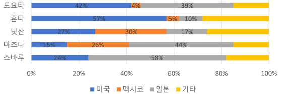 일본 자동차 연관 산업 취업자는 2023년 기준 558만 명(전체 취업자의 8.3%)에 달하며, 주로 중소·소규모 기업이어서 대응 여력이 취약합니다. 자동차 관세 부과 시 완성차 업계는 자국 내 생산 일부를 미국으로 이전하고, 북미 공장을 확장할 것으로 예상됩니다. 혼다는 향후 2~3년 내 미국 내 생산량을 최대 30% 확대해 미국 판매량의 90%를 현지 생산한다는 전략을 발표했고, 닛산·마쓰다·스바루·미쓰비시 등은 미국 내 생산 확대와 부품 조달 비율 상승을 검토하고 있습니다 . 그러나 중소 부품업체 약 6만 개 사와 지역 경제에 미치는 부정적 파급은 불가피해 보입니다.